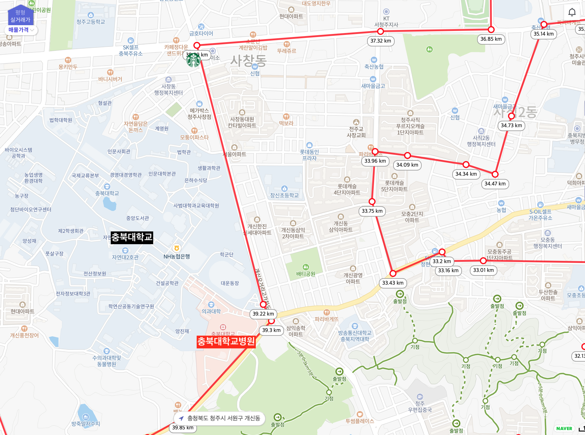 특히 청주의료원쪽으로 넘어가는 길 대빵 무서웠다. 종합운동장과 한벌초를 끼고 다시 내려왔다.