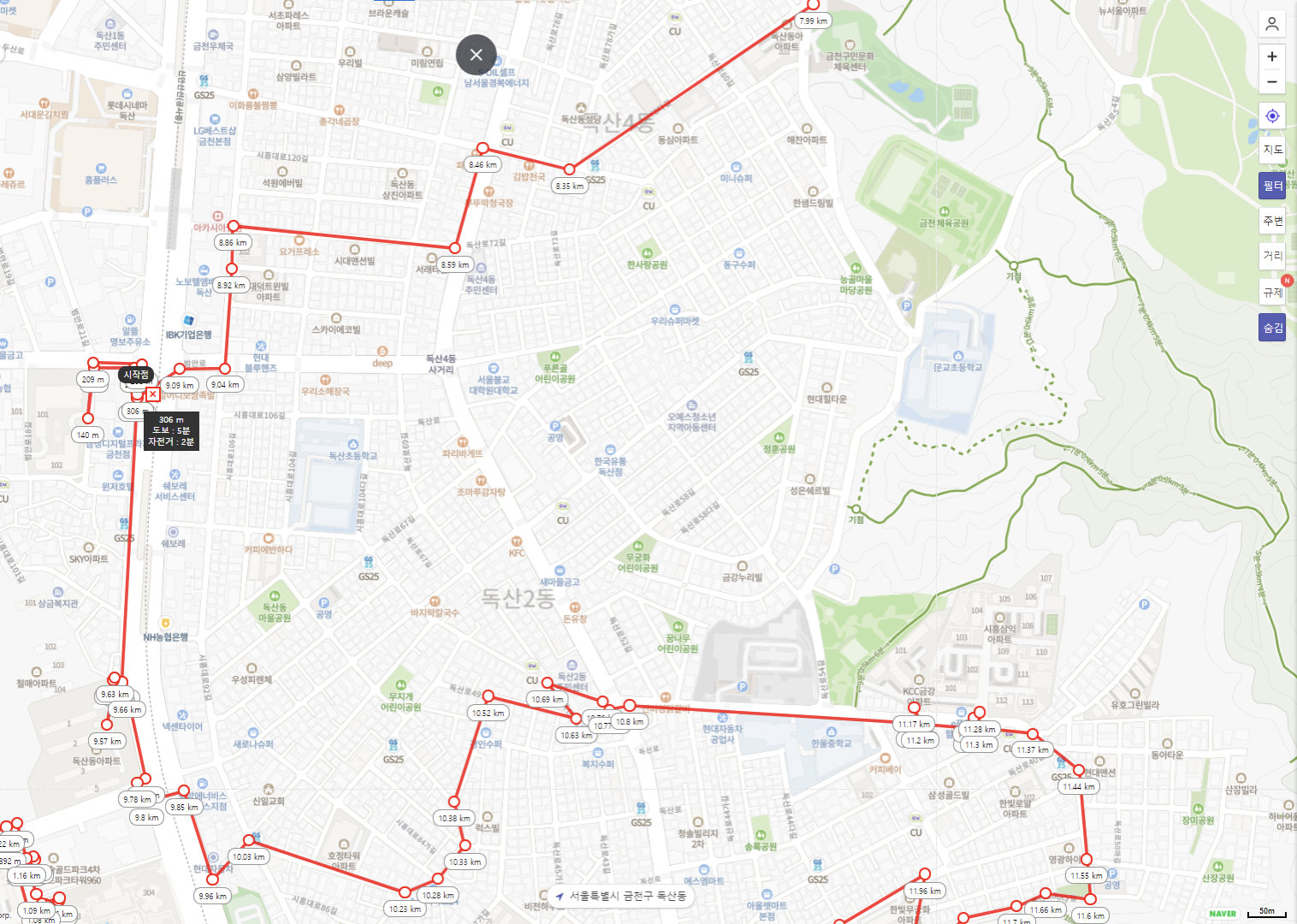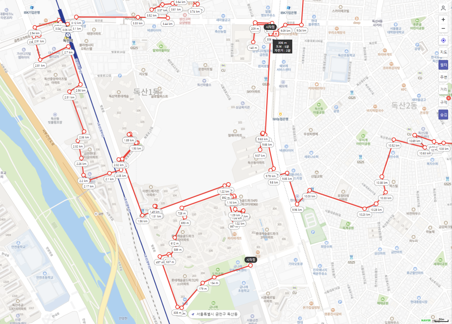 내리막~~~ 미니스톱부근에서 오르막이 되어 독산로까지 가는길을 뛰어갔다 으샤으쌰