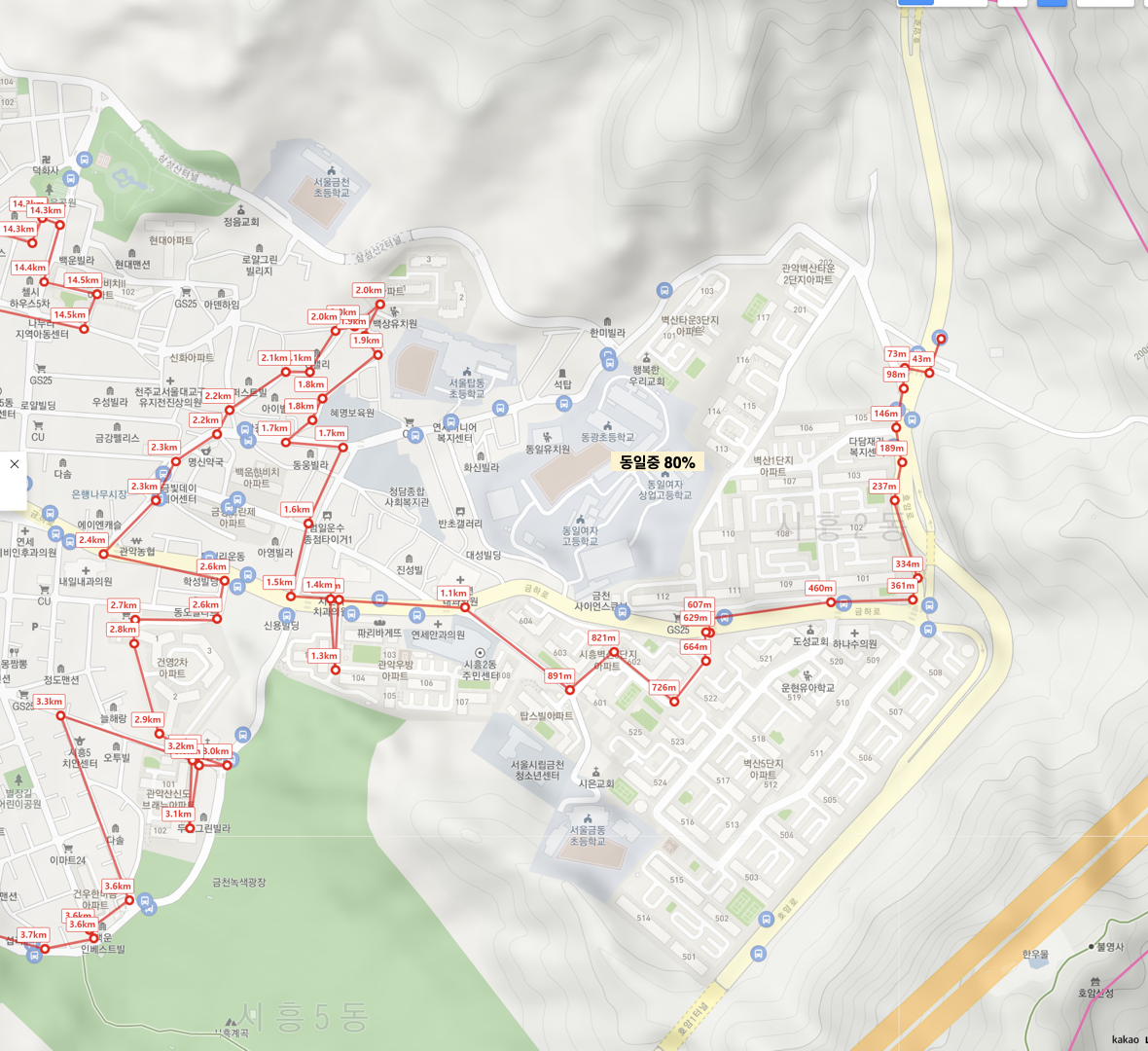 루트상에 럭키아파트 3동 5동 까지 들어가는 거였는데 딱히 의미없어보여 문일고등학교만 보고 안쪽은 안 들어갔다.