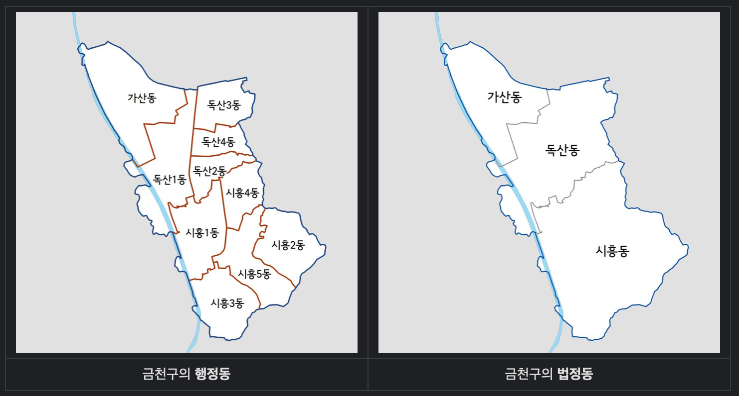 우선 금천구의 행정동과 법정동은 다음과 같다.