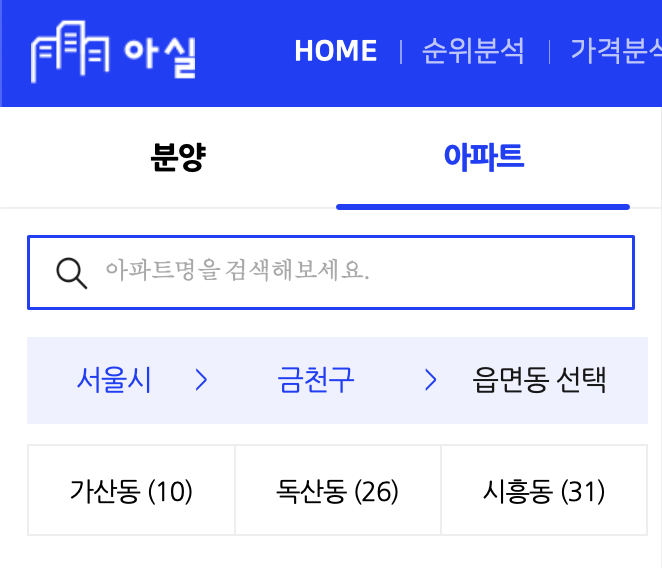 아실에서 금천구내 아파트를 동별로 찾아보면 다음과 같이 나온다.